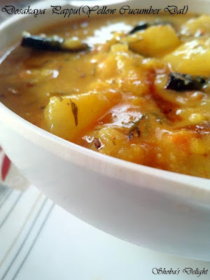 Yellow cucumber/Dosakayya pappu is all time favourite dal. This dhal tastes very different and can be made quick with less ingredients.Dosakaya/Yellow cucumber is a tangy vegetable which belongs to cucumber family. It enhances the flavour the taste of the dish.Yellow Cucumber is very commonly cooked in Andhra Pradesh as Dal, Pickle . It is very commonly available in Karnataka.. Dosakai is small, round and yellow, pretty much look like a small melon. It belongs to the cucumber family.