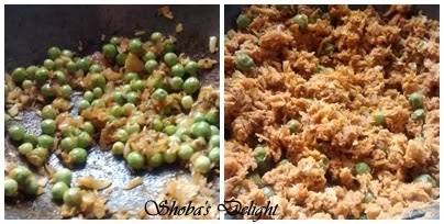 Heat oil in a kadai, add onions and sauté till light brown. Add ginger garlic paste and then followed by green peas. Sauté for few minutes till it gets cooked well. Now add the grated soya chunks with the masala powders. Check for salt. Keep aside.